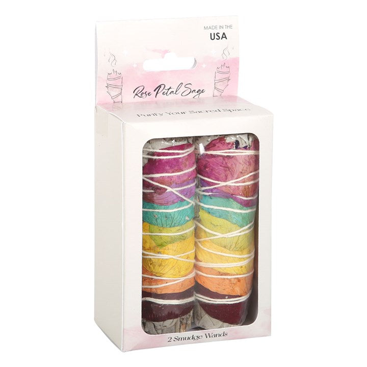 This set includes 2 bundles of dried white sage, known as smudge sticks or wands, accented by a rainbow of dried rose petals. Traditionally used for spiritual cleansing rituals, smudge sticks are essential tools in reiki, witchcraft and other sacred practices. Made in the USA.