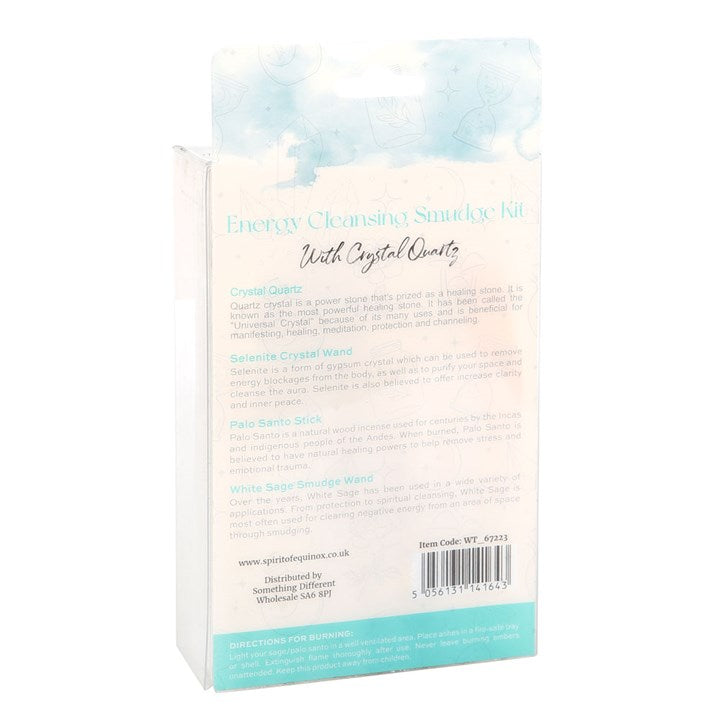 This smudge kit includes everything you need to cleanse your space of negative energies - just minus the match! Kit includes one bundle of dried white sage, a stick of palo santo, a selenite wand and a clear quartz tumblestone crystal for protection and inner healing.